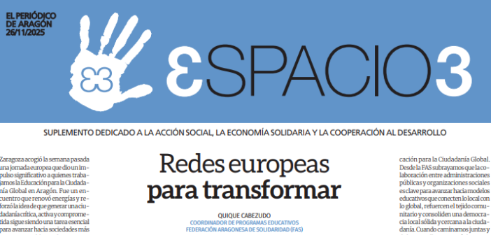 «Redes europeas para transformar» – Artículo publicado el 26 de noviembre de 2025 en el suplemento Espacio3 de El Periódico de Aragón. Escrito por Quique Cabezudo (coordinador de proyectos educativos de la FAS).